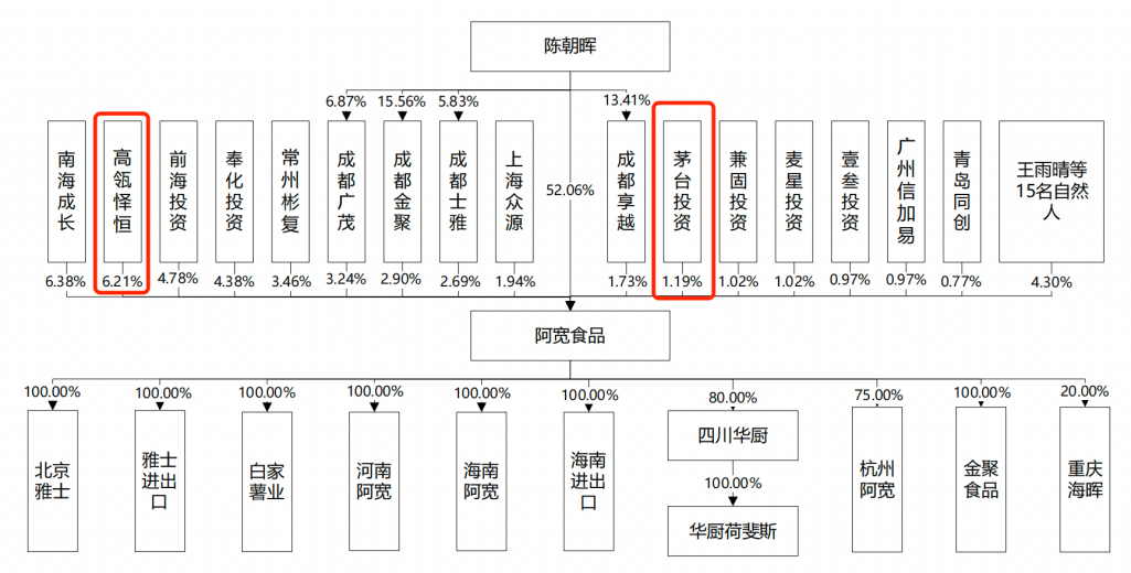 截至招股書簽署之日,高瓴懌恒持有阿寬食品6.21%的股份;茅臺(tái)投資持有公司1.19%的股份。