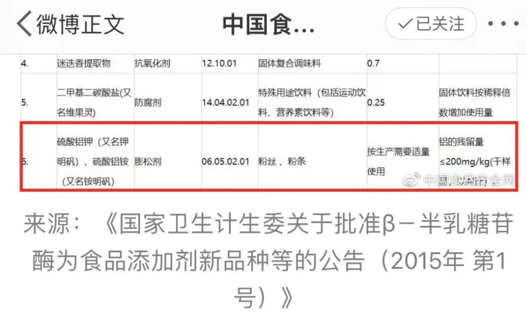 此外,今年中國(guó)食品安全報(bào)發(fā)布的《3.15特別報(bào)道|10款熱銷酸辣粉測(cè)評(píng)》一文中,阿寬食品代工的麻六記酸辣粉、李子柒酸辣粉均被點(diǎn)名,產(chǎn)品被檢測(cè)出來不但使用的原料不全是其宣傳的純紅薯粉,而且添加了銨明礬。經(jīng)過添加銨明礬的粉條不僅增加了光澤和彈性,吃起來更筋道,還能實(shí)現(xiàn)久煮不爛的效果。