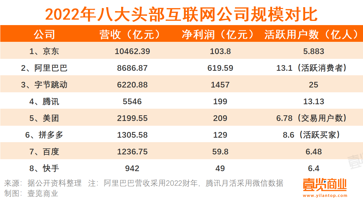 考慮到字節(jié)跳動(dòng)的營(yíng)收規(guī)模,增速放緩也可以理解。與此同時(shí),從2021年虧損71.5億美元到2022年200億凈利潤(rùn),字節(jié)跳動(dòng)的主營(yíng)業(yè)務(wù)實(shí)現(xiàn)了扭虧為盈。壹覽商業(yè)橫向?qū)ν惼髽I(yè)發(fā)現(xiàn),國(guó)內(nèi)互聯(lián)網(wǎng)巨頭格局,正在發(fā)生改變。