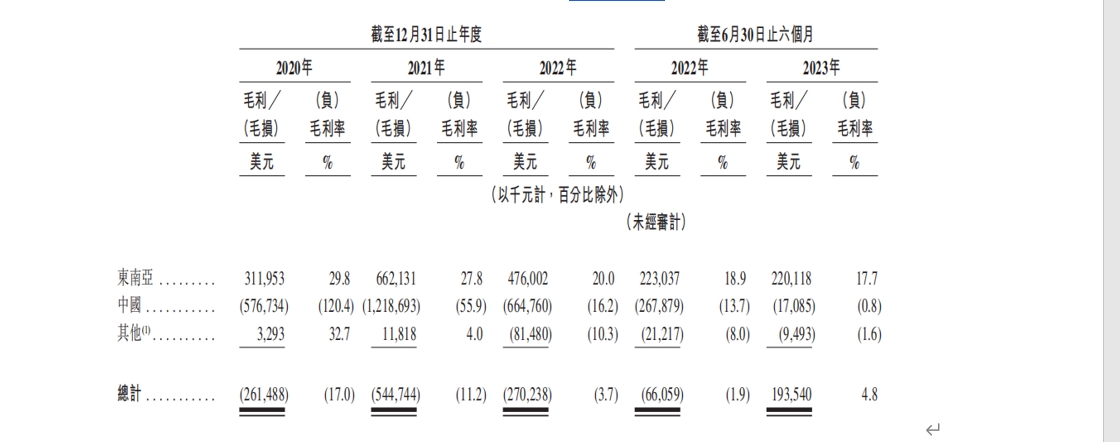 各區(qū)市場毛利(毛損)與毛利率(毛損率),圖源招股書