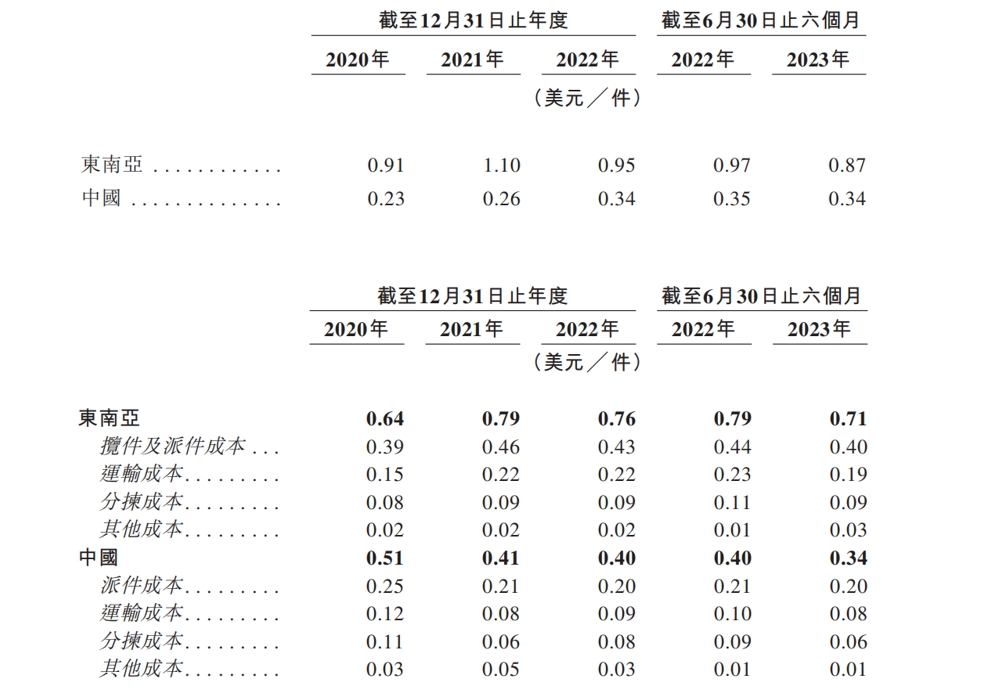 從單票價格與單票成本來看,極兔在東南亞市場和中國市場的近三年平均單票收入分別為0.99美元/件、0.28美元/件,而近三年平均單票成本分別為0.73美元/件、0.44美元/件,這就意味著,極兔在東南亞每做一單能獲利0.26美元,在中國則是每做一單虧損0.16美元。