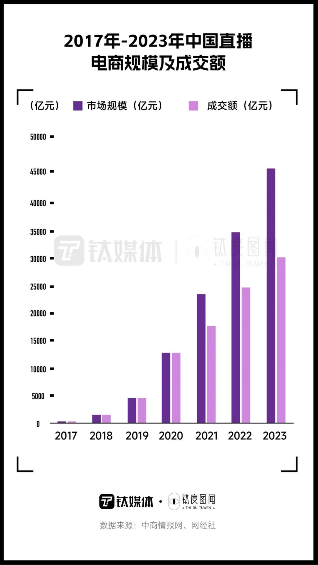 2023年上半年,直播電商交易規(guī)模約為19916億元,預(yù)計(jì)全年規(guī)模達(dá)到45657億元,同比增長(zhǎng)30.44%,較2017年增長(zhǎng)超232倍;直播電商成交額預(yù)計(jì)全年將達(dá)30159億元,較2017年增長(zhǎng)超112倍。