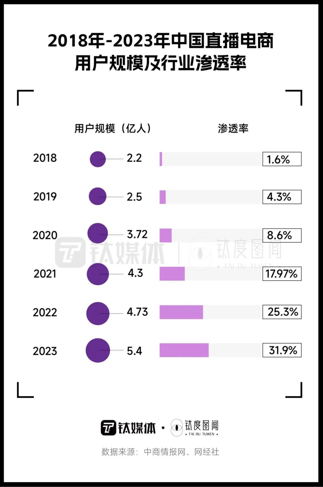 中國(guó)直播電商行業(yè)已經(jīng)走過(guò)了初創(chuàng)期和快速發(fā)展期,直播電商行業(yè)滲透率逐步提升。2018年,直播電商行業(yè)滲透率為1.6%;2023年上半年,直播電商交易額滲透率約為27.8%,預(yù)計(jì)全年直播電商行業(yè)滲透率達(dá)到31.9%,比2018年上漲30個(gè)百分點(diǎn)。