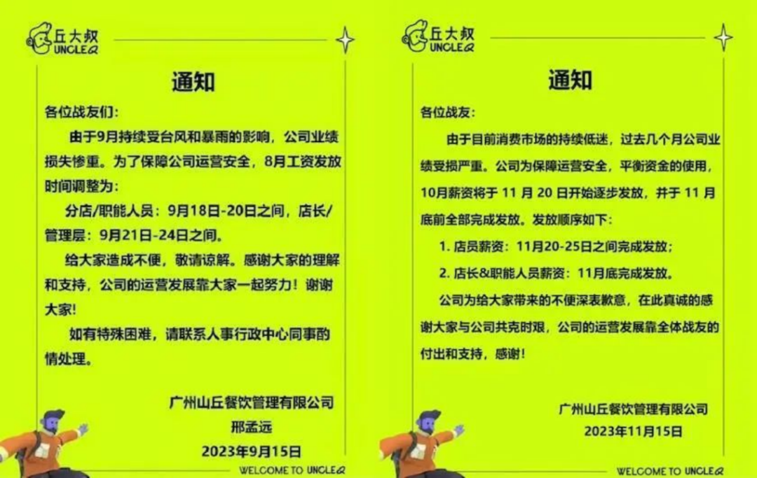 據(jù)員工爆料發(fā)出的內(nèi)部通知,丘大叔給出的欠薪理由包括:7月受臺風影響破壞電信和金融基礎設施,導致發(fā)薪信息丟失;9月持續(xù)受臺風和暴雨影響,公司業(yè)績損失慘重;11月通知則稱由于消費市場持續(xù)低迷,過去幾個月公司業(yè)績受損嚴重。