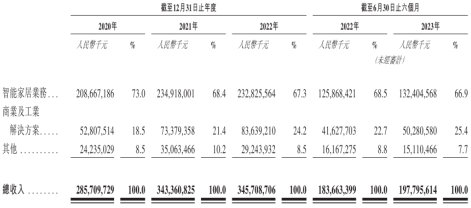 從營收構成上看,智能家居業(yè)務仍是美的集團核心收入來源。數(shù)據(jù)顯示,2020年-2022年,美的智能家居業(yè)務實現(xiàn)營收分別為2086.67億元、2349.18億元、2328.26億元,收入占比分別為73%、68.4%和67.3%。