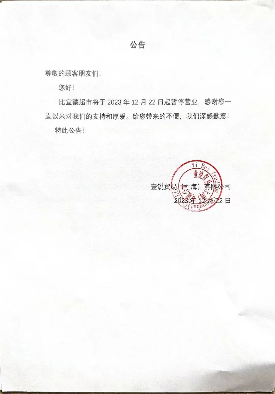 12月23日,主打硬折扣的低價超市比宜德發(fā)布公告,宣布自12月22日起暫停營業(yè)。
