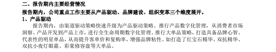 2020年,珀萊雅(603605.SH)在年度報(bào)告中首次提到了“大單品策略”,正是這一年,紅寶石精華、雙抗精華、小夜燈眼霜等單品開始嶄露頭角。