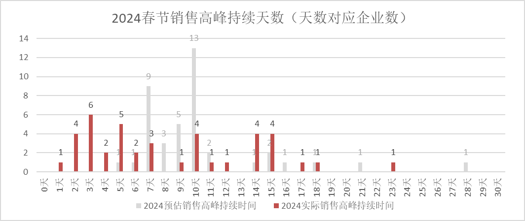 2、因除夕當(dāng)日不放假,銷售高峰期的持續(xù)時(shí)間對(duì)比往年有所變短(大部分為7天及以內(nèi))。