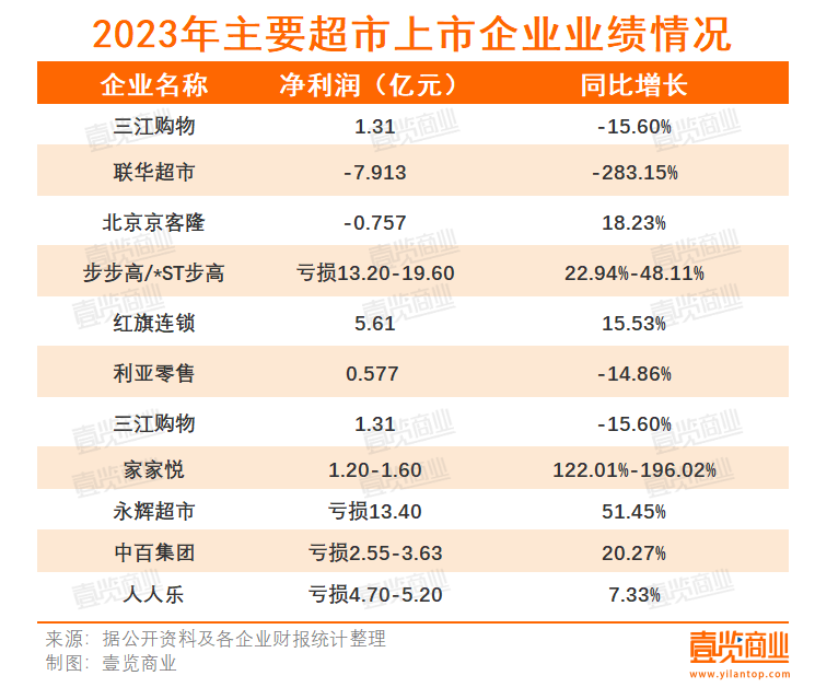 從業(yè)績(jī)來看,不少商超企業(yè)形勢(shì)嚴(yán)峻。數(shù)據(jù)顯示,11家已公布業(yè)績(jī)報(bào)告或業(yè)績(jī)預(yù)告的超市企業(yè)中,有6家處于虧損狀態(tài),4家處于微盈利狀態(tài),而成績(jī)最為矚目的紅旗連鎖,僅取得凈利潤(rùn)5.61億的成績(jī)。