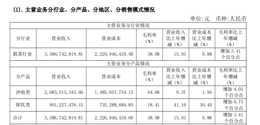 當時,香飄飄超過98%的營收,都是來自于杯裝奶茶的生產(chǎn)和銷售。到了2023年,這一比例降至了74.88%,新增的液體奶茶、果汁茶業(yè)務(wù)貢獻的營收正在逐年增長。