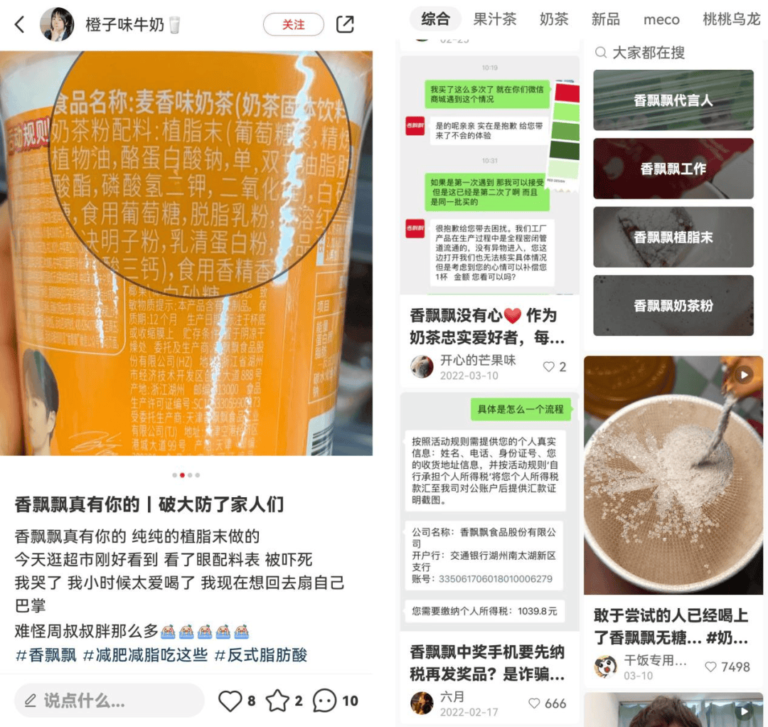 翻看香飄飄沖泡奶茶配料表發(fā)現(xiàn),其奶茶粉配料、奶茶果配料中均含有白砂糖、食用葡萄糖等。能量表中碳水化合物占比12%。除此之外,香飄飄奶茶還給單配一包白砂糖用于調(diào)節(jié)甜度。在小紅書平臺上搜索“香飄飄”,大量評論都在討論植脂末含量的問題;甚至有網(wǎng)友還開玩笑說,終于找到了周杰倫發(fā)胖的原因。