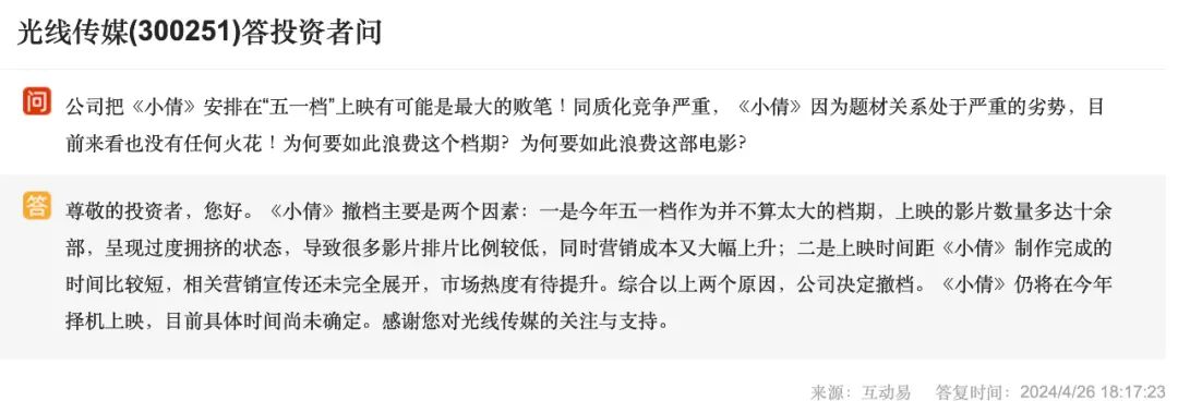 對基于古典文本的動畫作品《小倩》而言,五一檔的多部動畫電影不僅帶來了受眾重疊的風險,還放大了《小倩》在IP熱度方面的劣勢。對此,光線傳媒也在投資者互動平臺上表示,《小倩》之所以撤檔,是檔期過度擁擠、相關(guān)宣傳不足的結(jié)果。