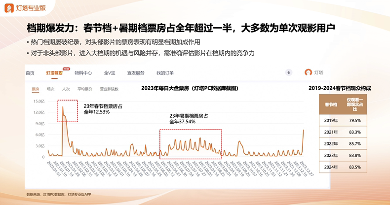 燈塔專業(yè)版發(fā)布的《觀眾購票決策的變化趨勢報告》顯示,2023年春節(jié)檔票房占到全年總票房的12.53%,暑期檔票房占全年的37.54%,二者之和占到全年票房的一半以上。