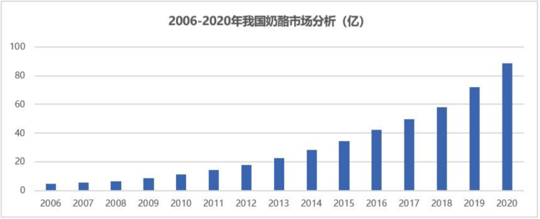 數(shù)據(jù)顯示,2020年我國(guó)奶酪行業(yè)市場(chǎng)規(guī)模達(dá)到88.43億元,較2019年同比增長(zhǎng)22.72%,2006—2020年復(fù)合增長(zhǎng)率超過(guò)20%。預(yù)計(jì)未來(lái)5-10年內(nèi)市場(chǎng)規(guī)模有望突破千億元大關(guān)。