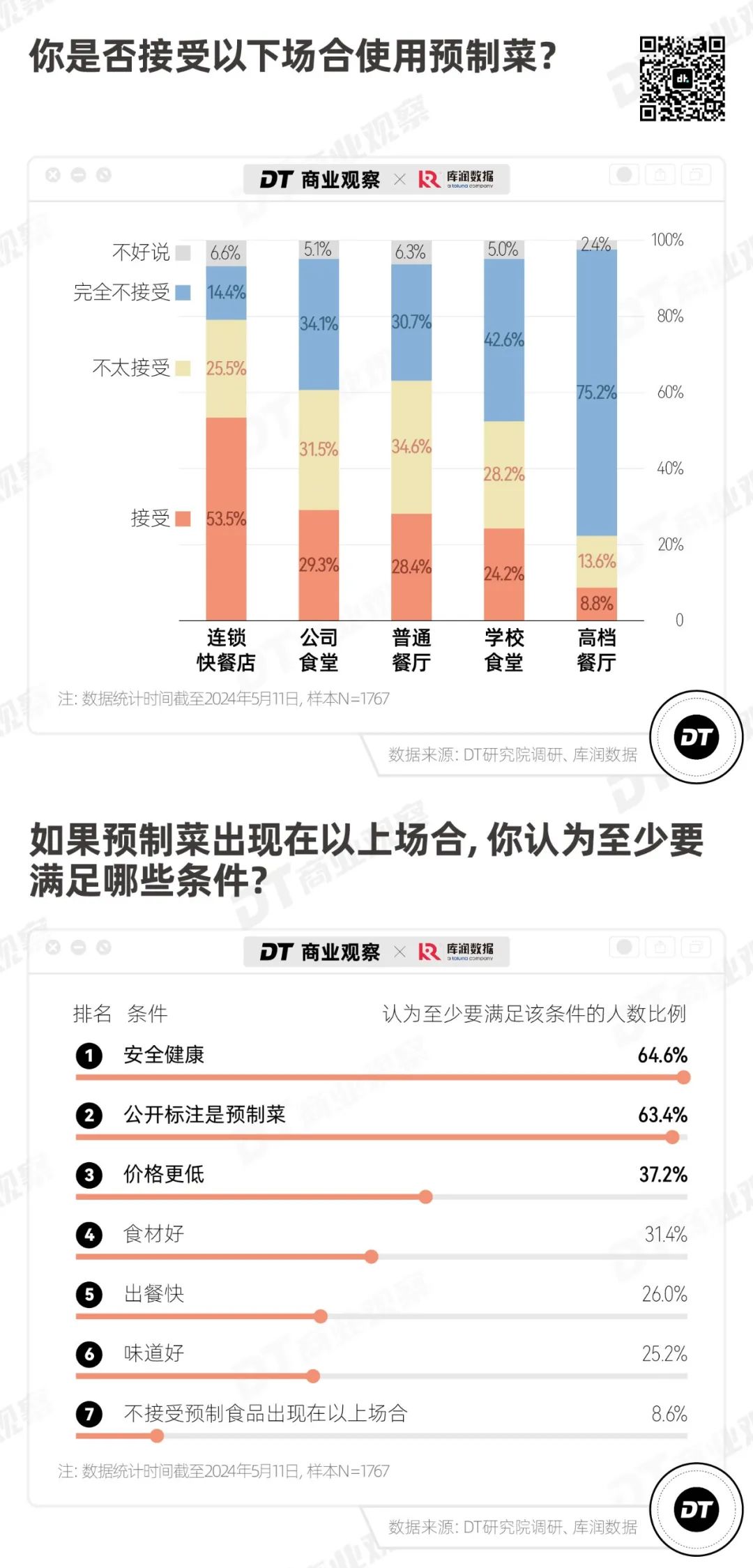 上個(gè)月,我們發(fā)起了“你能接受預(yù)制菜嗎”小調(diào)研,本次用定量研究方式,累計(jì)回收有效樣本1767個(gè),其中500個(gè)樣本來(lái)自庫(kù)潤(rùn)數(shù)據(jù)。