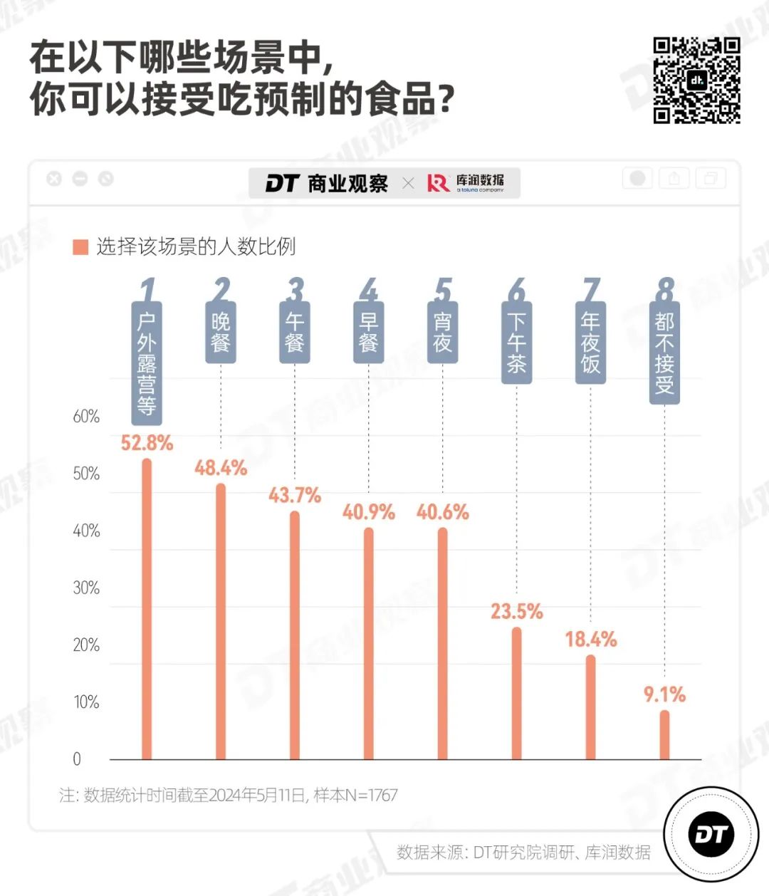 數(shù)據(jù)顯示,人們對(duì)在戶外露營(yíng)的場(chǎng)景下吃預(yù)制菜的接受度最高,占比為52.8%。