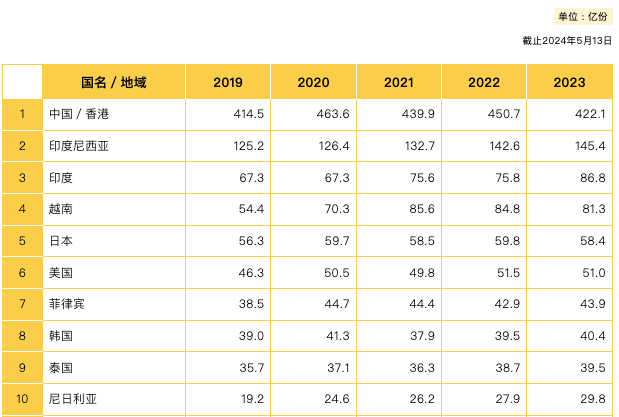 根據(jù)世界方便面協(xié)會(huì)(WINA)發(fā)布的方便面需求數(shù)據(jù),2023年,中國(guó)內(nèi)地和香港地區(qū)需求達(dá)422.1億份,是排名第二位的印度尼西亞的三倍有余,而在2020~2022年的疫情特殊時(shí)期,更是分別達(dá)到了463.6億份、439.9億份和450.7億份。