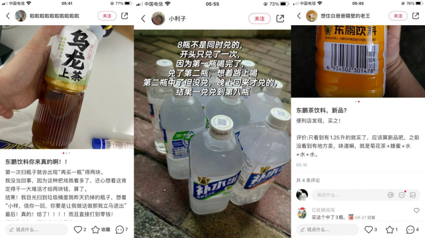 東鵬飲料復(fù)刻了過去的打法,“大玩”開蓋贈(zèng)飲的“高中獎(jiǎng)率”玩法。包括“烏龍上茶”“補(bǔ)水啦”“菊花茶”等飲品,在社交平臺(tái)上都被消費(fèi)者曬出有開蓋贈(zèng)飲的“超高中獎(jiǎng)率”。