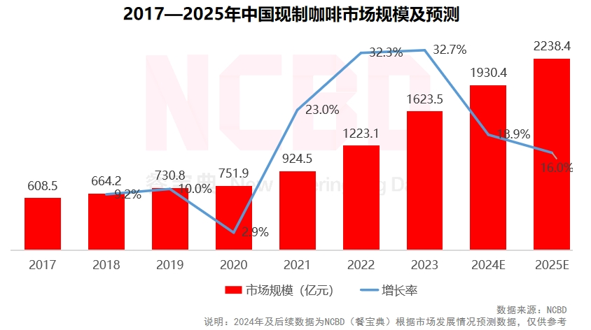 餐寶典數(shù)據(jù)顯示,2023年,中國(guó)現(xiàn)制咖啡市場(chǎng)規(guī)模突破1600億元,達(dá)到1623.5億元,增長(zhǎng)較為明顯;預(yù)計(jì)到2025年,中國(guó)現(xiàn)制咖啡市場(chǎng)規(guī)模將突破2200億元,但已經(jīng)明顯呈下降趨勢(shì),市場(chǎng)飽和之勢(shì)明顯。