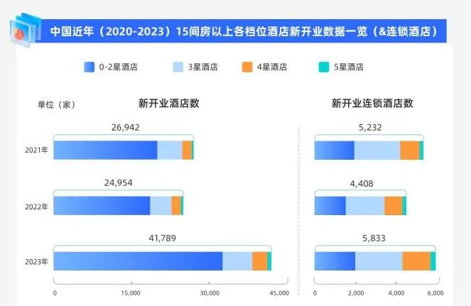 也因此,連鎖酒店們開(kāi)新店的步伐也加快了。酒店之家驛鏡數(shù)據(jù)研究院發(fā)布的《2024中國(guó)酒店投資白皮書(shū)》顯示,2021~2023年,酒店新開(kāi)業(yè)數(shù)量呈現(xiàn)出“先降低,再升高”的趨勢(shì),特別是2023年,無(wú)論是新開(kāi)業(yè)酒店數(shù),還是新開(kāi)業(yè)連鎖酒店數(shù),均躍升至一個(gè)“新量級(jí)”。