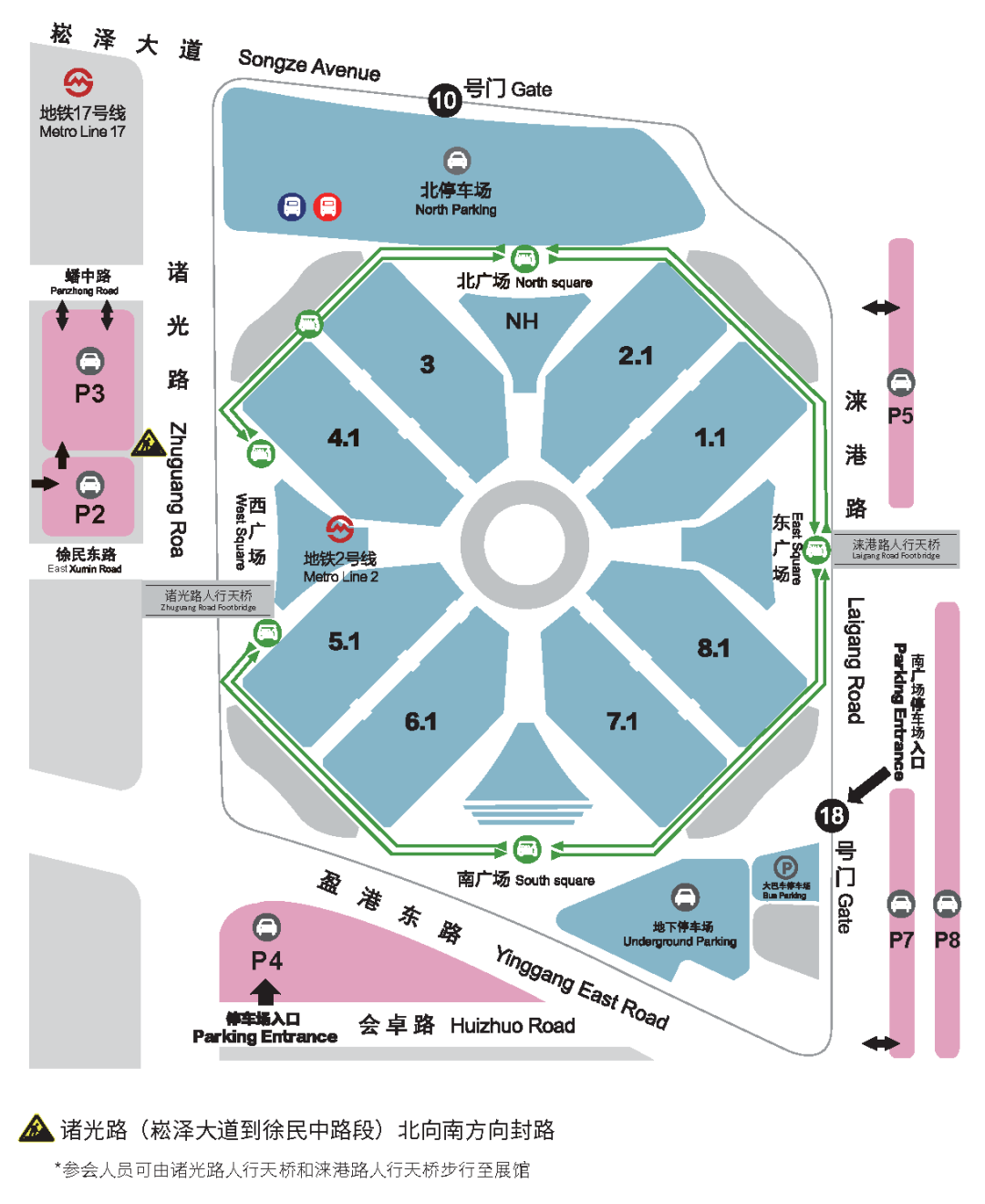 網(wǎng)約車(chē)請(qǐng)導(dǎo)航至國(guó)家會(huì)展中心(上海)P8和P15停車(chē)場(chǎng)下車(chē)。