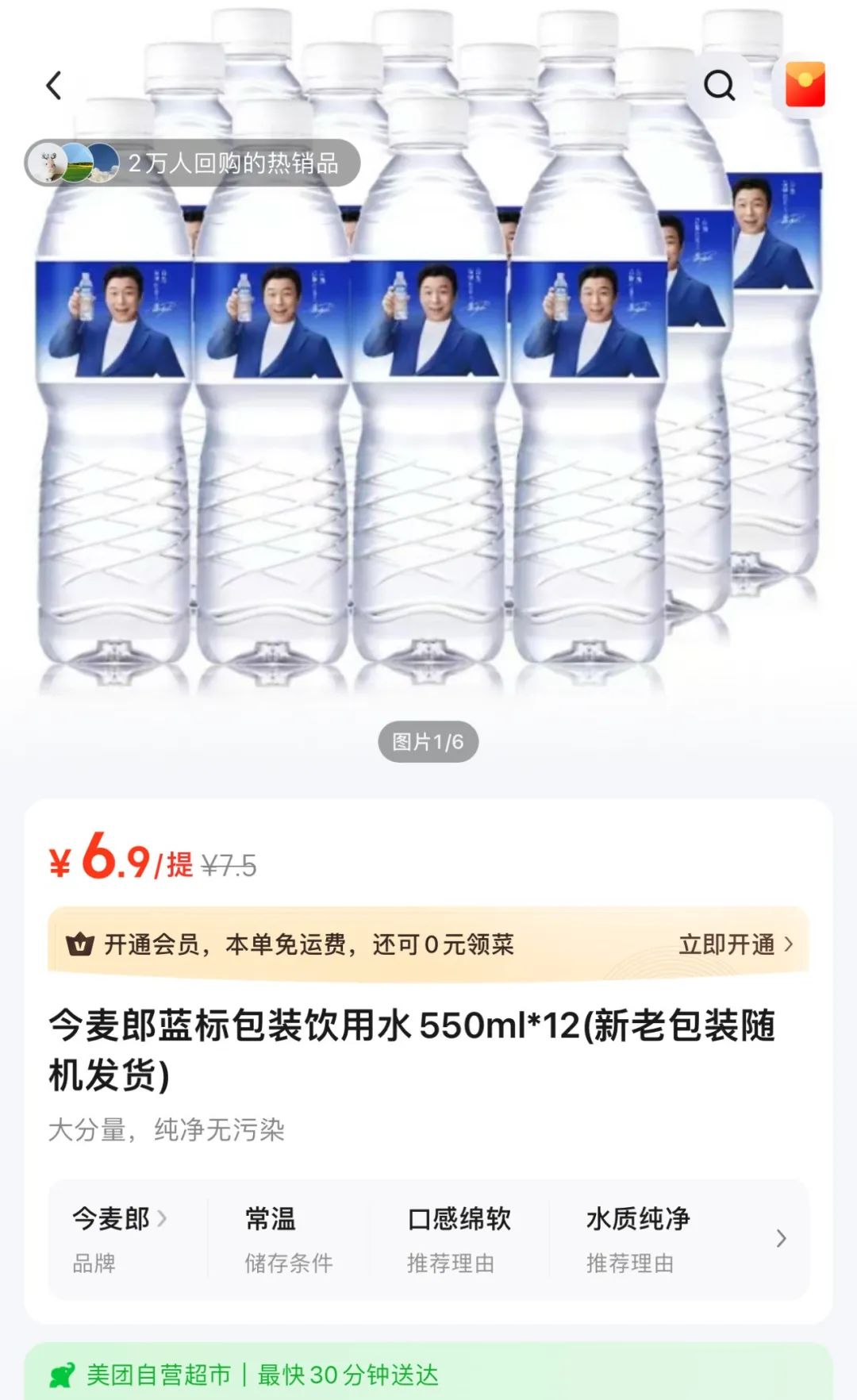 在美團(tuán)旗下小象超市,「新消費(fèi)101」觀察到,12瓶550ml今麥郎藍(lán)標(biāo)包裝飲用水(以下簡(jiǎn)稱“藍(lán)標(biāo)水”)促銷價(jià)為6.9元,每瓶約5毛7。