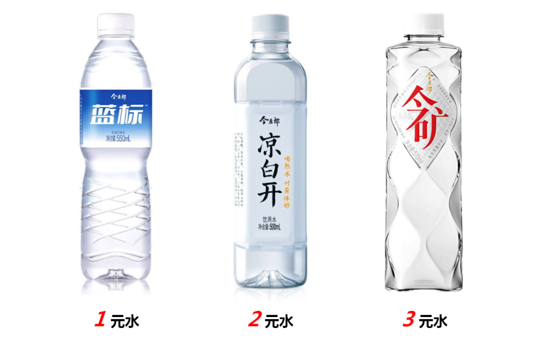 拆解來看,在今麥郎飲用水產(chǎn)品矩陣中,1元水指前述藍(lán)標(biāo)水,2元水指熟水“涼白開”,3元水則是高端礦泉水“今礦”。