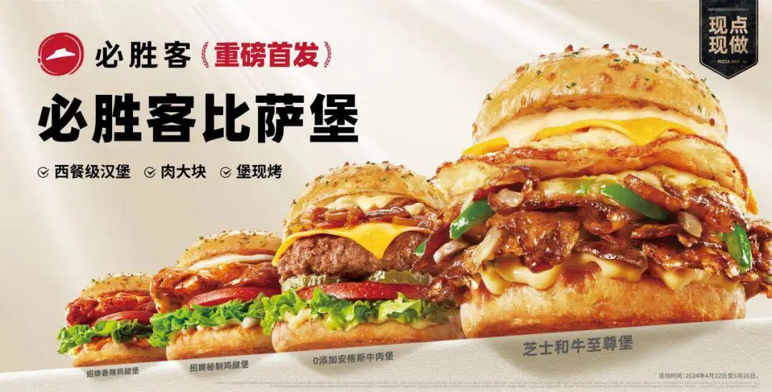 早在4月份,必勝客就在全國(guó)2000家門(mén)店上新了“比薩堡”,西餐級(jí)大塊肉搭配必勝客獨(dú)有的“比薩面包”,現(xiàn)點(diǎn)現(xiàn)烤,19.9元起,最頂級(jí)的芝士和牛至尊堡只要32元。