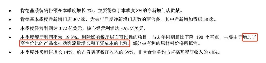 百勝中國(guó)2024 年第一季度財(cái)務(wù)業(yè)績(jī)報(bào)告顯示,肯德基的餐廳利潤(rùn)率為19.3%,同比下降1.9個(gè)百分點(diǎn)。報(bào)告還特別提到,下降的原因是增加了高性價(jià)比產(chǎn)品,例如肯德基版本的“窮鬼套餐”——OK三件套,黃金SPA雞排堡+中薯?xiàng)l+可樂(lè),只要19.9元。