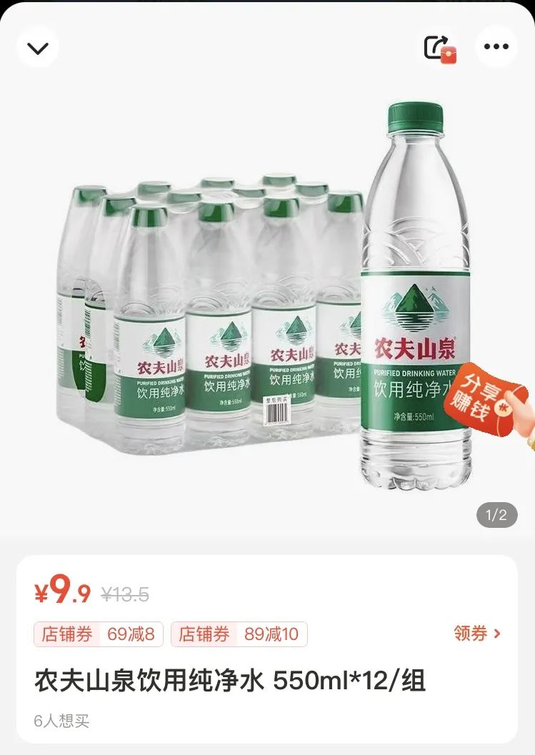 在社交平臺(tái)上,最近時(shí)常能看到這樣的評(píng)論。在網(wǎng)友曬出的超市售價(jià)圖里,每12瓶一提的農(nóng)夫山泉綠瓶水,分別出現(xiàn)過9.9元、8.8元、7.9元的售價(jià),折合每瓶0.83、0.733、0.66元。在部分限時(shí)特價(jià)的電商平臺(tái),甚至還出現(xiàn)了12瓶5.9元、3元、1.9元的薅羊毛價(jià)格。