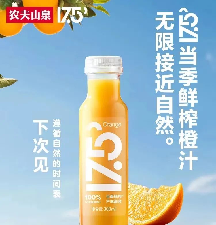 在產(chǎn)品端,以農(nóng)夫山泉另一個(gè)尚未在消費(fèi)者層面大規(guī)模鋪開、但已受業(yè)界廣泛贊譽(yù)的產(chǎn)品17.5°橙為例。