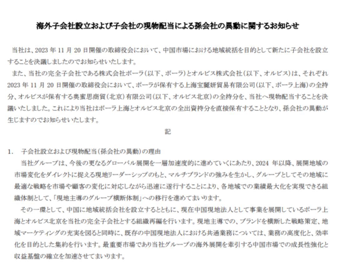 對于成立新子公司的決定,POLA集團在相關通知中表示,在中國設立區(qū)域總部是集團為進一步加速推進全球擴張所作的重要動作。這將使集團能夠充分利用多品牌組合的優(yōu)勢,快速實施最佳區(qū)域戰(zhàn)略,同時適應市場和客戶的變化,也將最大限度地提高各個地區(qū)的業(yè)務能效。