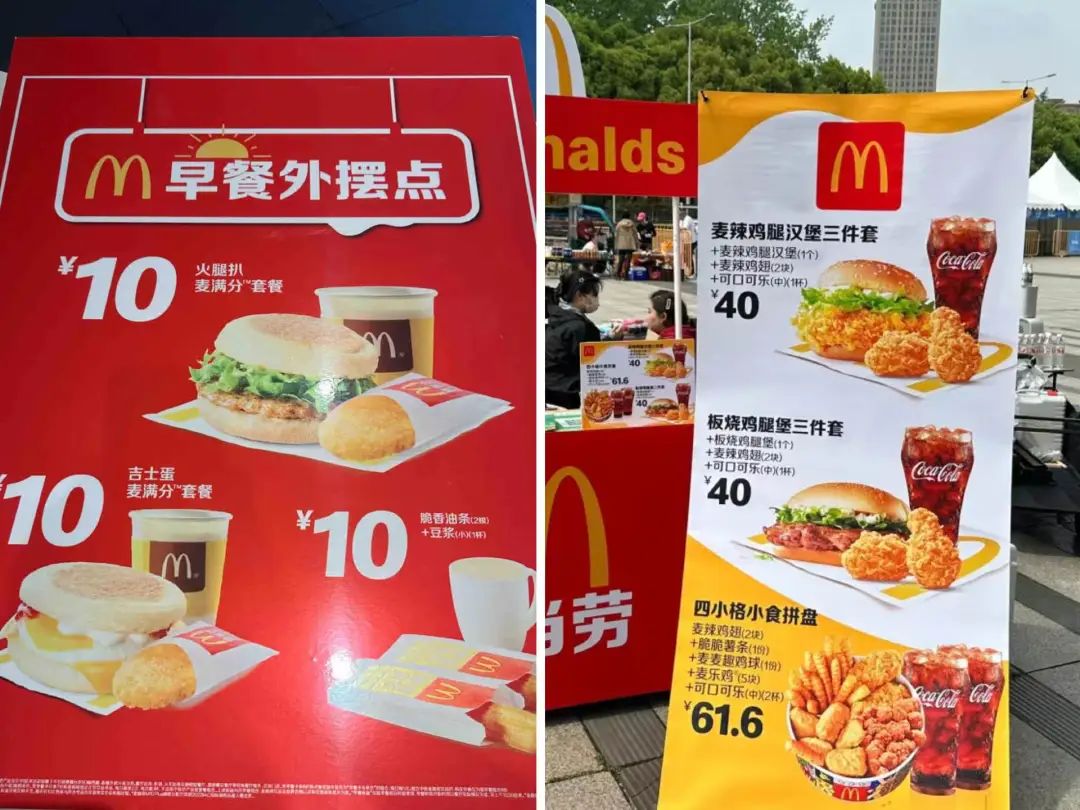 從各地網(wǎng)友曬出的圖片可以看到,麥當(dāng)勞近幾年在全國范圍內(nèi)都曾有過擺小攤的嘗試,小攤產(chǎn)品以固定套餐為主,比如早餐時段的“10元盲盒”,包括豆?jié){油條、薯餅麥滿分等套餐;下午時段的套餐則是經(jīng)典的“麥辣雞腿漢堡三件套”、“板燒雞腿堡三件套”等。