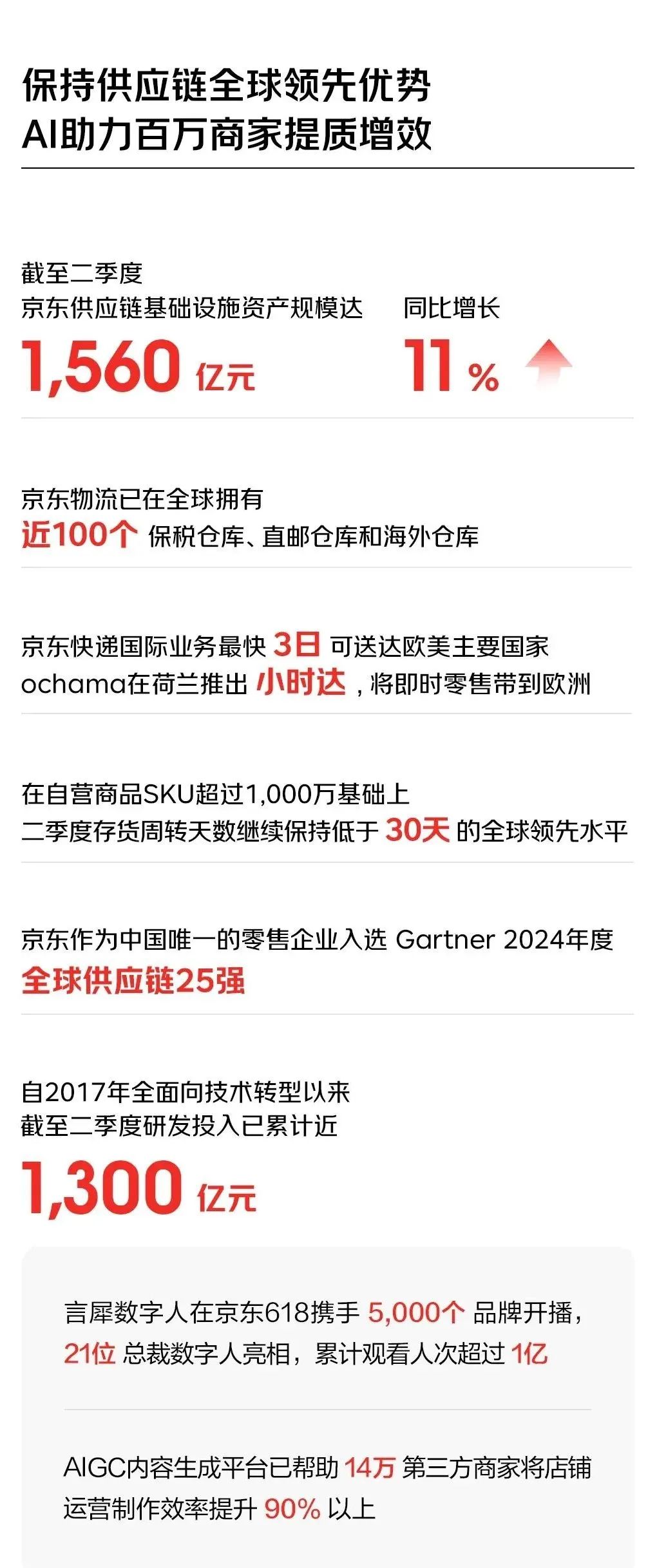 截至二季度,京東的供應鏈基礎設施資產(chǎn)規(guī)模達1,560億元人民幣,同比增長11%。