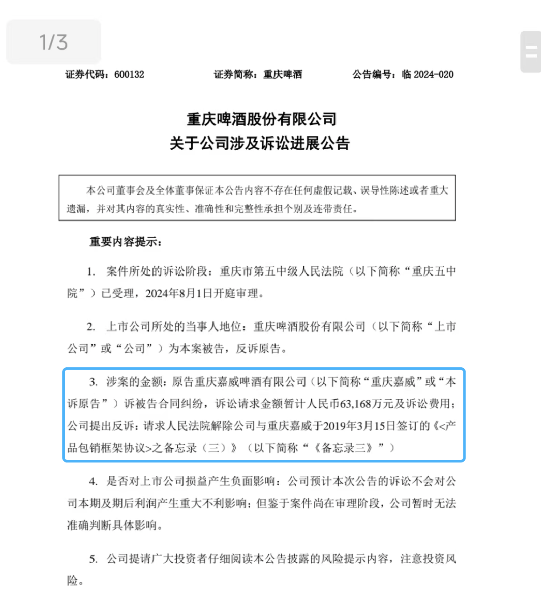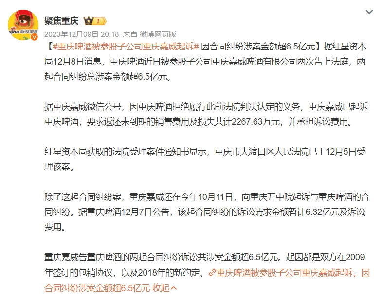 2022年,重慶嘉威撤訴,但矛盾并未緩解。2023年12月,重慶嘉威再次對重慶啤酒提起訴訟,要求賠償各項經(jīng)濟損失6.32億元,重慶啤酒表示,此次是重慶嘉威在2022年撤訴之后就相同合同、基本相同的理由再更換法院提起訴訟。