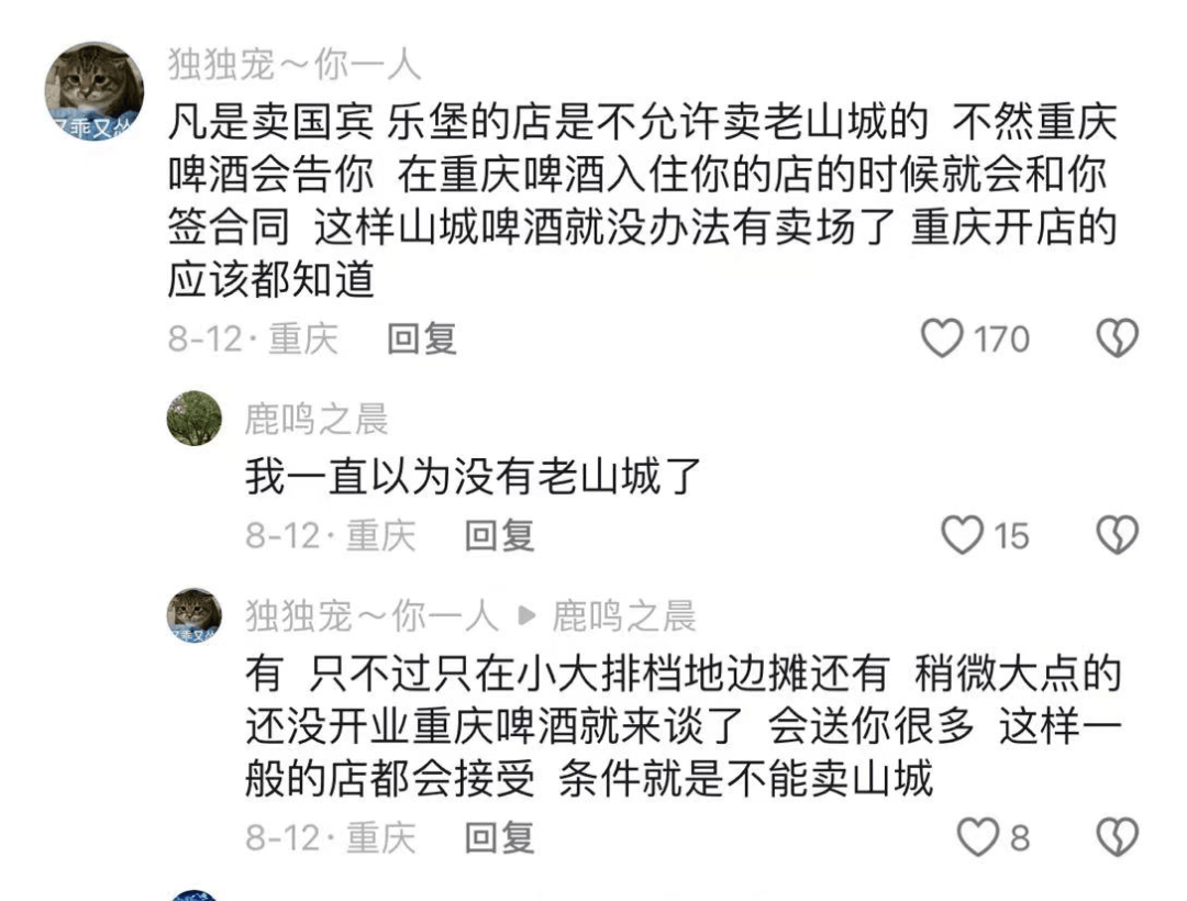 還有重慶網(wǎng)友表示,“凡是賣國賓、樂堡的店是不允許賣老山城的,不然重慶啤酒會告你,在重慶啤酒入住你的店的時候就會和你簽合同,這樣山城啤酒就沒辦法有賣場了,重慶開店的應該都知道!
