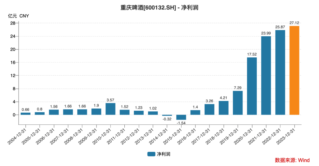 數(shù)據(jù)顯示,2013年,嘉士伯剛剛接手時,重慶啤酒的凈利潤只有1.02億元;到了2023年,重慶啤酒凈利潤27.12億元,十余年間翻了26倍。