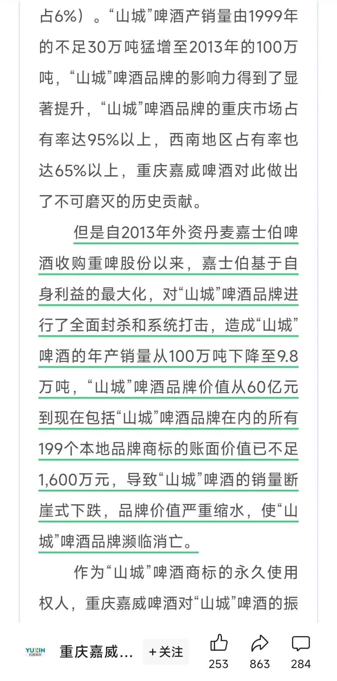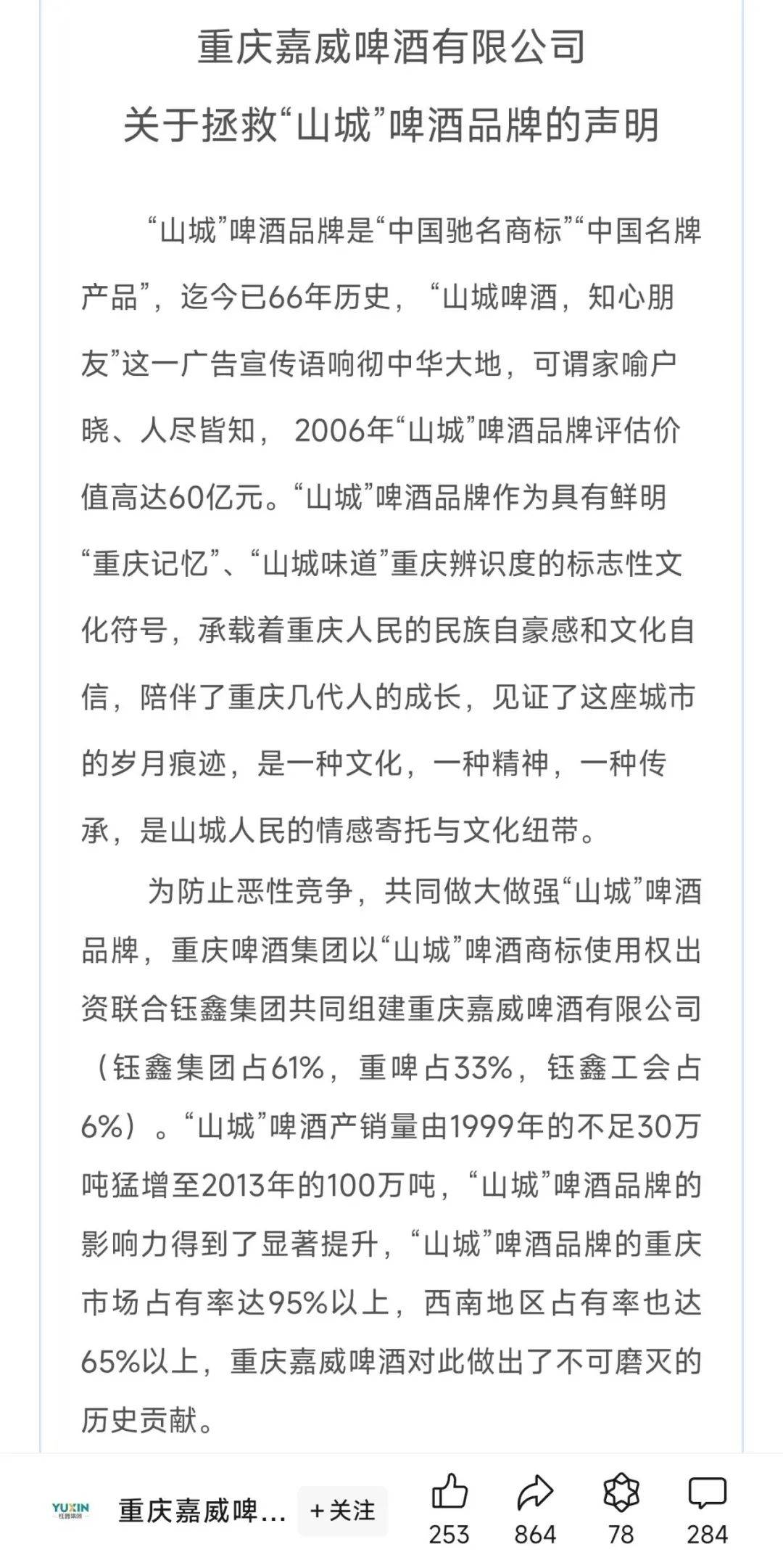 而在半年度業(yè)績發(fā)布之前,山城啤酒的生產(chǎn)商重慶嘉威啤酒有限公司(下稱“重慶嘉威”)在其公眾號發(fā)布了一篇題為《重慶嘉威啤酒有限公司關于拯救“山城”啤酒品牌的聲明》的“檄文”,將矛頭直指重慶啤酒實控人——外資啤酒巨頭嘉士伯;其認為“嘉士伯基于自身利益的最大化,對‘山城’啤酒品牌進行了全面封殺和系統(tǒng)打擊”。