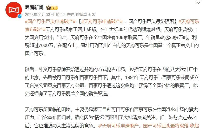 除此之外,同處川渝地區(qū),與百事可樂合資的天府可樂也是一個典型的例子。