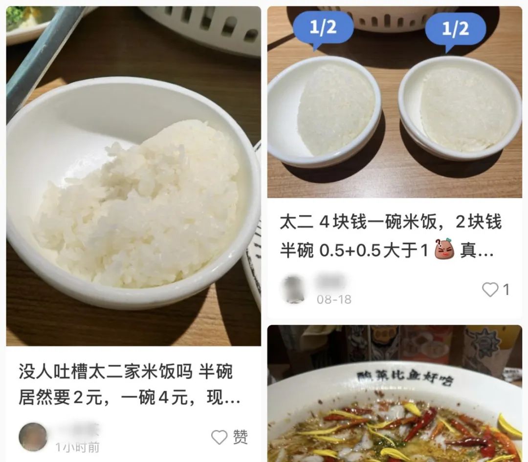 在此過(guò)程中,對(duì)于太二米飯5元一碗的價(jià)格,部分網(wǎng)友覺(jué)得貴,有的還發(fā)帖吐槽。隨著消費(fèi)環(huán)境變得低迷,此類吐槽越發(fā)洶涌。