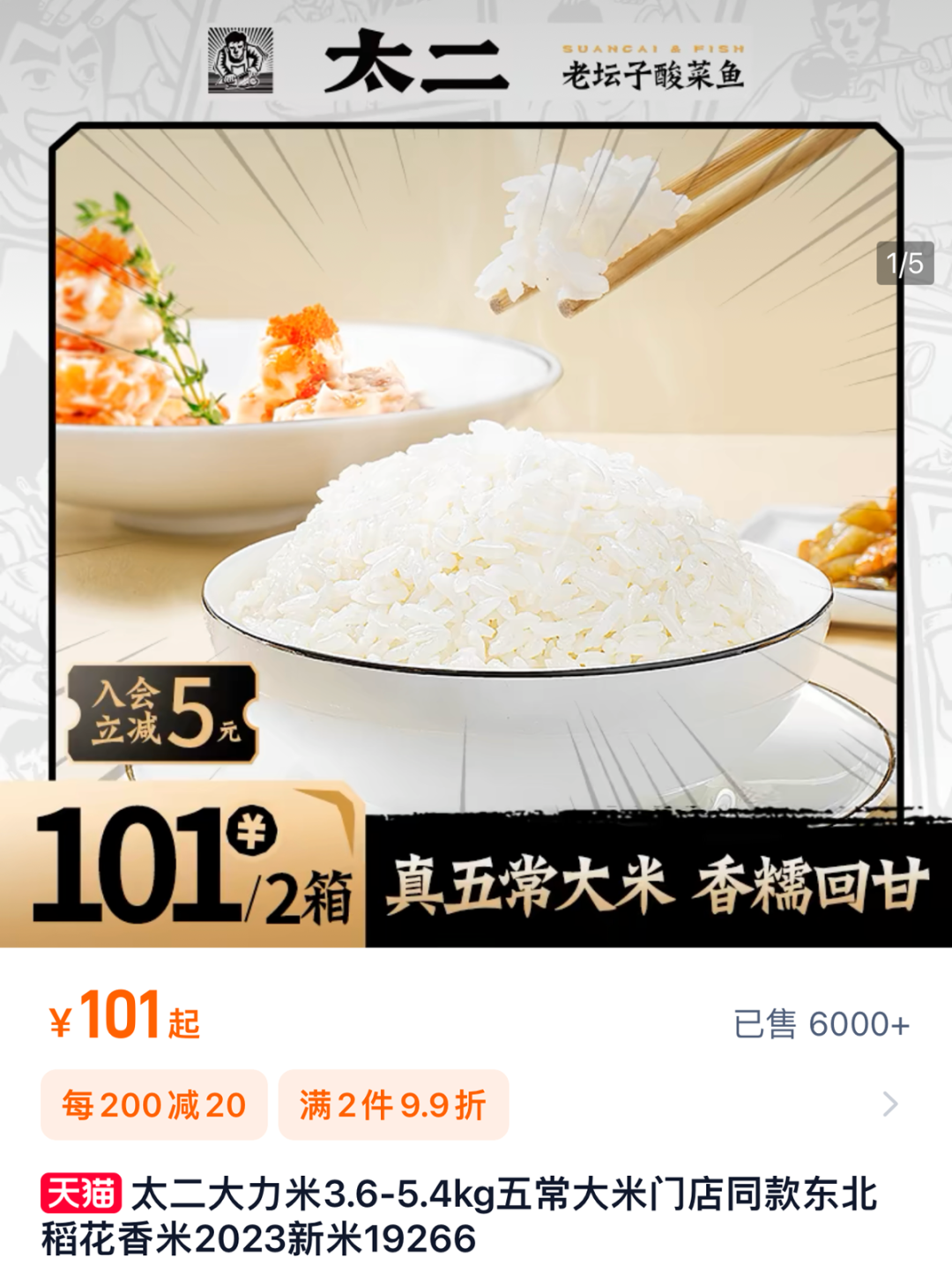 在天貓太二官方旗艦店,太二酸菜魚(yú)門店同款大米為“太二大力米”,推介語(yǔ)強(qiáng)調(diào)這款米“吃飽有勁,生活有力”,凸顯“來(lái)自五常大米核心產(chǎn)區(qū)”“在家吃門店同款”。