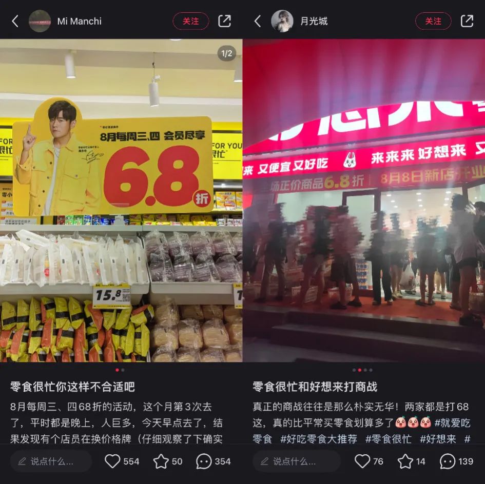 “自從好想來開在了對(duì)面,零食很忙就開啟了各種折扣,一個(gè)月平均三四次,就像不要錢了!庇袑庎l(xiāng)的消費(fèi)者稱,“好想來把每一家店都開在了零食很忙對(duì)面或旁邊。沒人能拒絕薅羊毛,店里排隊(duì)倆小時(shí)起步,人均3筐。”