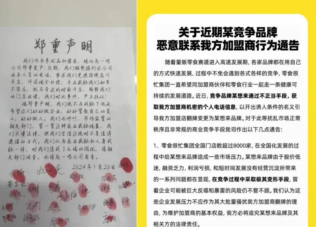 隨后,網(wǎng)絡(luò)上流傳出一張疑似來自零食很忙集團(tuán)的通告,稱“競(jìng)爭(zhēng)品牌某想來通過不正當(dāng)手段,獲取我方加盟商機(jī)密的個(gè)人電話信息,以開出誘人條件的名義引導(dǎo)我方加盟店翻牌變更為某想來品牌”,落款日期為1月22日。