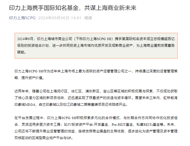 9月6日,印力上海官宣:攜手某國際知名資本成立總規(guī)模超百億級別的投資組合計劃,進一步共同投資上海市域內(nèi)優(yōu)質(zhì)開發(fā)及成熟商業(yè)資產(chǎn)。