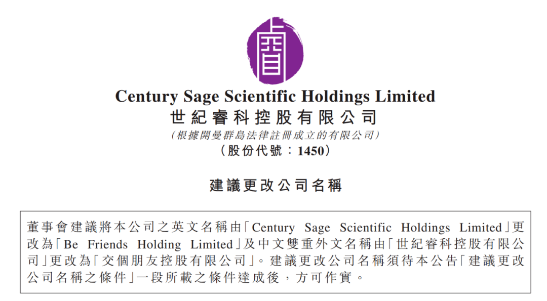 2023年7月6日,世紀睿科發(fā)布公告稱,公司用于聯(lián)交所進行證券買賣的英文及中文股份簡稱分別將由“CENTURY SAGE”及“世紀睿科”,更改為“BE FRIENDS HLDG”及“交個朋友控股”,交個朋友完成了曲線上市。