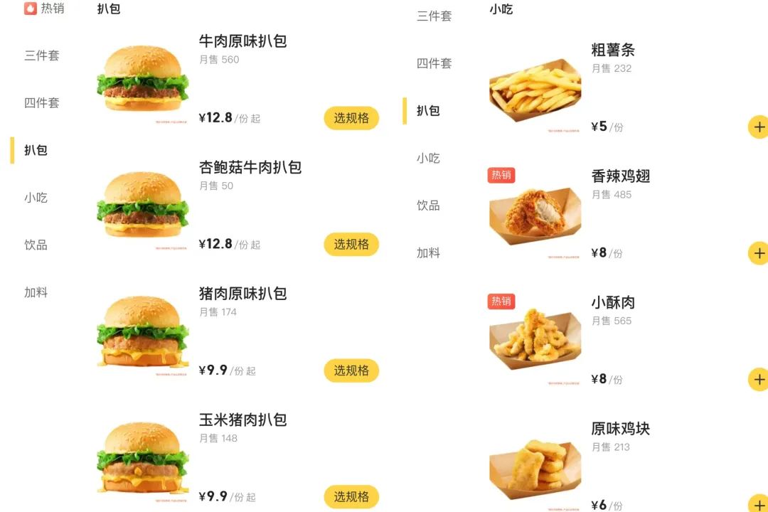 門店推出多達(dá)12款套餐,其中三件套有7款,包括豬肉原味扒包餐、兩人歡樂時(shí)光餐、一人豪華套餐等,四件套有5款,為香辣雞肉扒包4件套等。