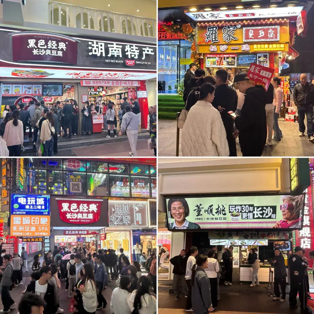 或許是因?yàn)樘鞖獗容^涼,不少?zèng)]有餐桌的烤魷魚(yú)、烤腸等小吃攤位前門庭冷落。意外的是,黑色經(jīng)典臭豆腐和董順桃臭豆腐門店前卻排起了長(zhǎng)龍,看來(lái)天氣再冷也無(wú)法阻擋游客們對(duì)長(zhǎng)沙臭豆腐的熱情。