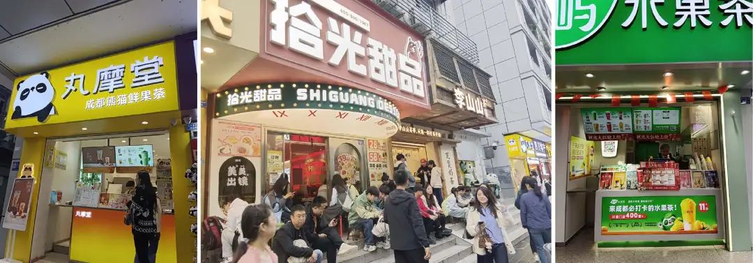 相似地,高壓競(jìng)爭(zhēng)下,奶茶店不斷更迭。曾經(jīng)的一批茶飲網(wǎng)紅撤出,陳多多豆腐奶茶、茶嶼水果茶、丸摩堂等成都本土品牌接手。其中最受歡迎的,一個(gè)是新晉網(wǎng)紅品牌李山山茶事,就是一家名為“拾光甜品”的自助甜品店。