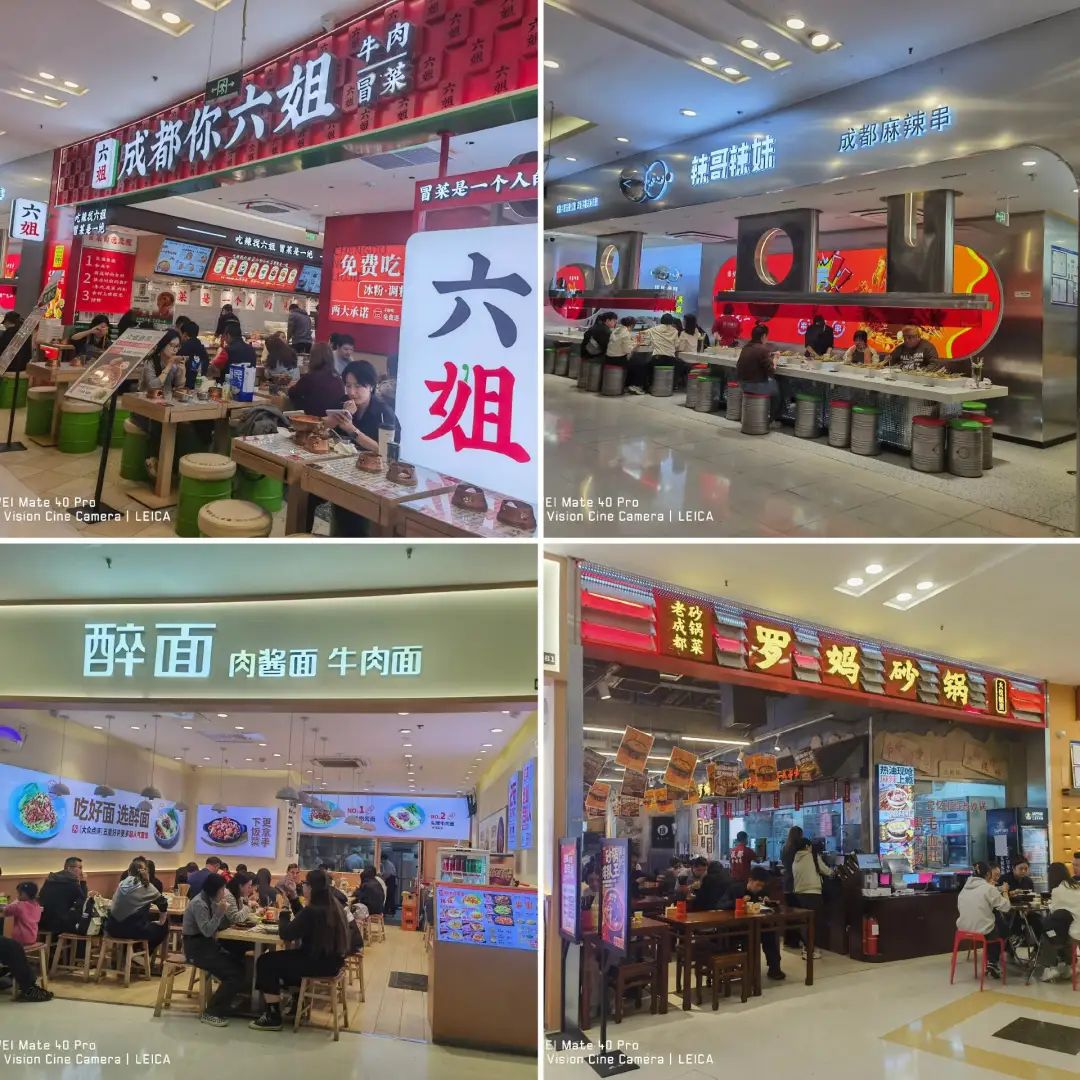 不過(guò),最受歡迎的還是成都本地的小吃、火鍋。小龍坎火鍋、廠花素芬火鍋、駱老媽 · 老媽蹄花、春陽(yáng)水餃 · 成都名小吃等店內(nèi)基本滿員。