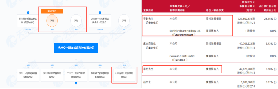 天眼查APP顯示,2023年,上述學(xué)員繳納學(xué)費的收款公司主體為北京交個朋友出?萍加邢薰荆ㄏ路Q“北京交個朋友”),現(xiàn)已更名為北京百瑞出海科技有限公司(下稱“北京百瑞”)。杭州交個朋友教育科技有限公司(下稱“杭州交個朋友”)為北京百瑞的企業(yè)法人,同時持股比例60%為大股東。